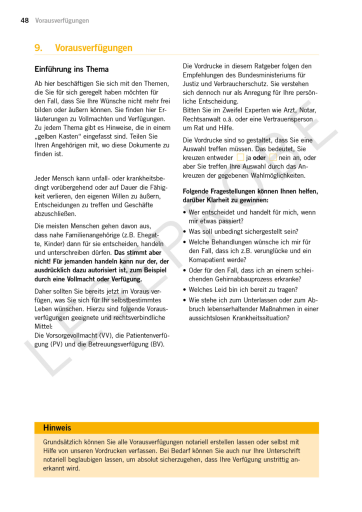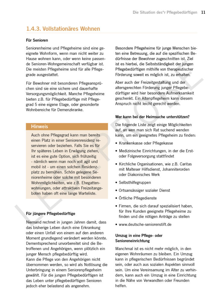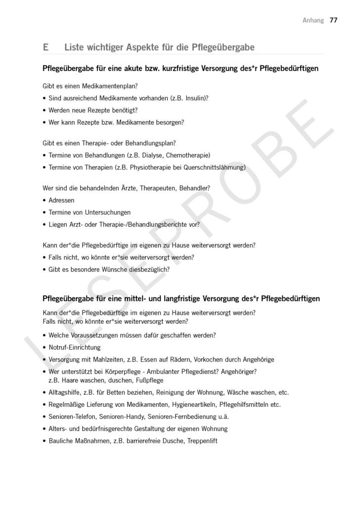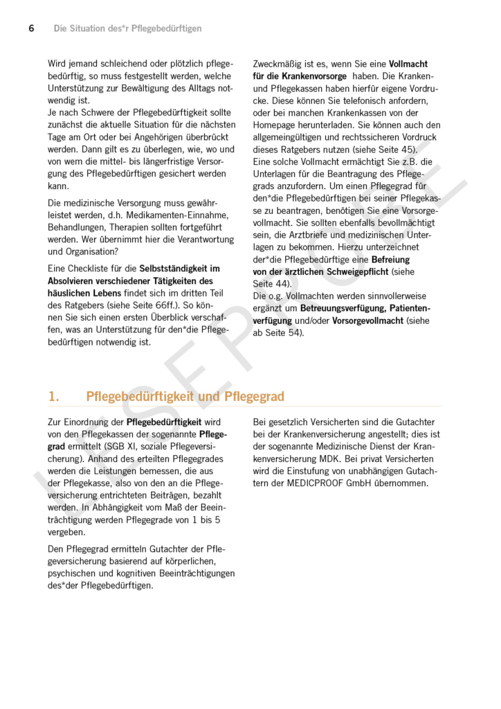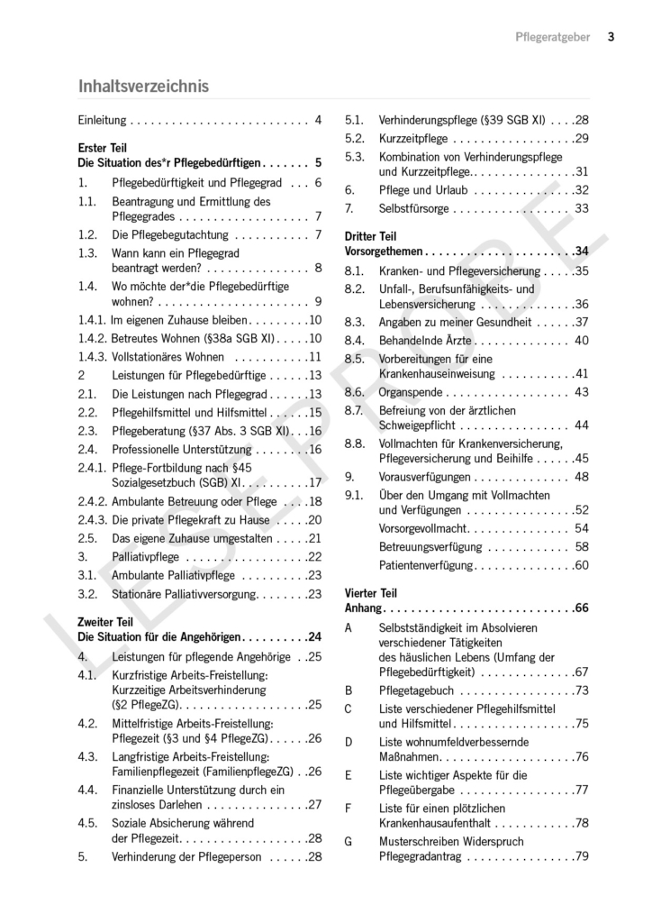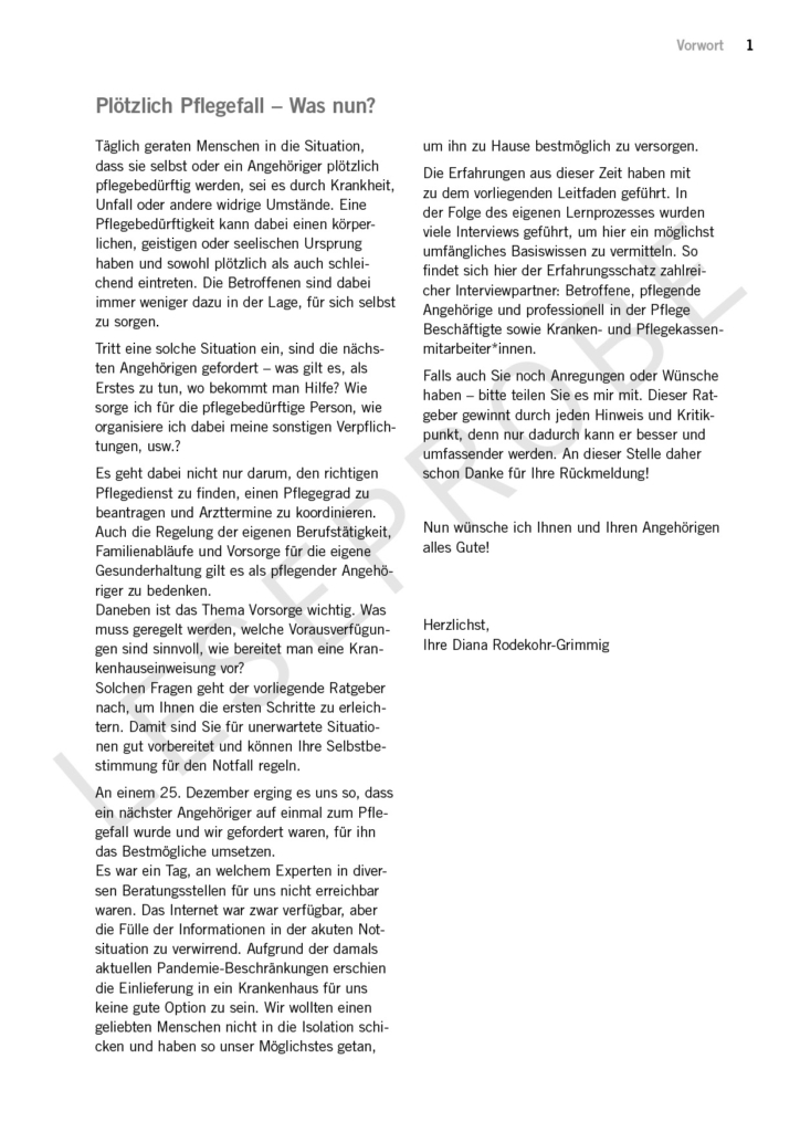 Zuletzt widmet sich die Autorin Vorsorge- und Gesundheitsthemen und stellt dazu juristisch geprüfte Vordrucke und Formulare zur Verfügung. Wichtig sind beispielsweise die Krankengeschichte mit Befunden und die aktuelle Medikation, ebenso wie die Kontaktdaten der behandelnden Ärzte. Viele nützliche Tipps rund um die Beantragung des Pflegegrades, ein Pflegetagebuch, die bundesweit wichtigsten Rufnummern für Krankenversorgung sowie Musterschreiben runden den Leitfaden ab und geben weitere Hilfestellung, um die verschiedenen Aspekte der Pflege bestmöglich zu bewältigen.